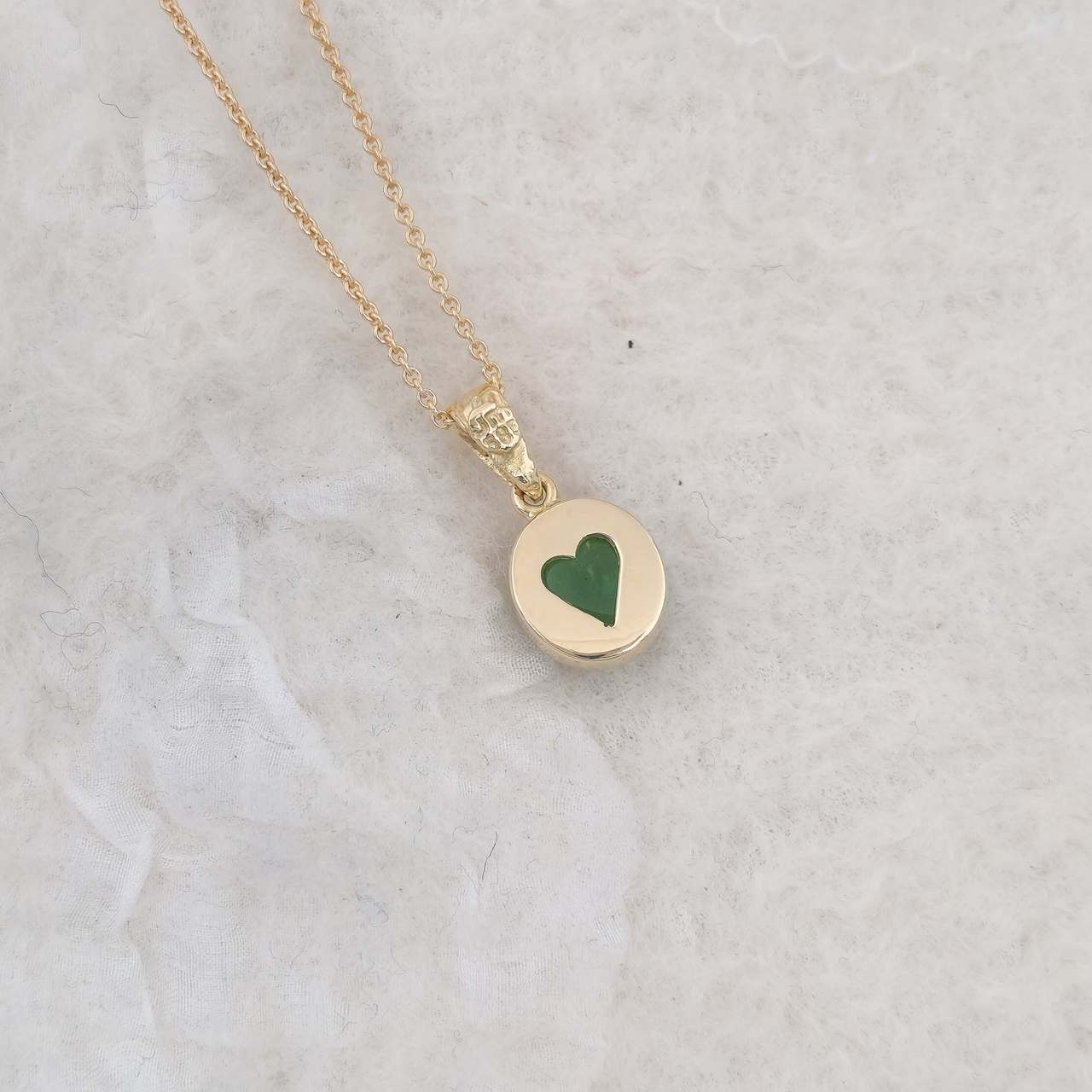 Anheng av glatt kasse med en cabochon grønn turmalin.Sisselert hempe og utsagd hjerte på baksiden