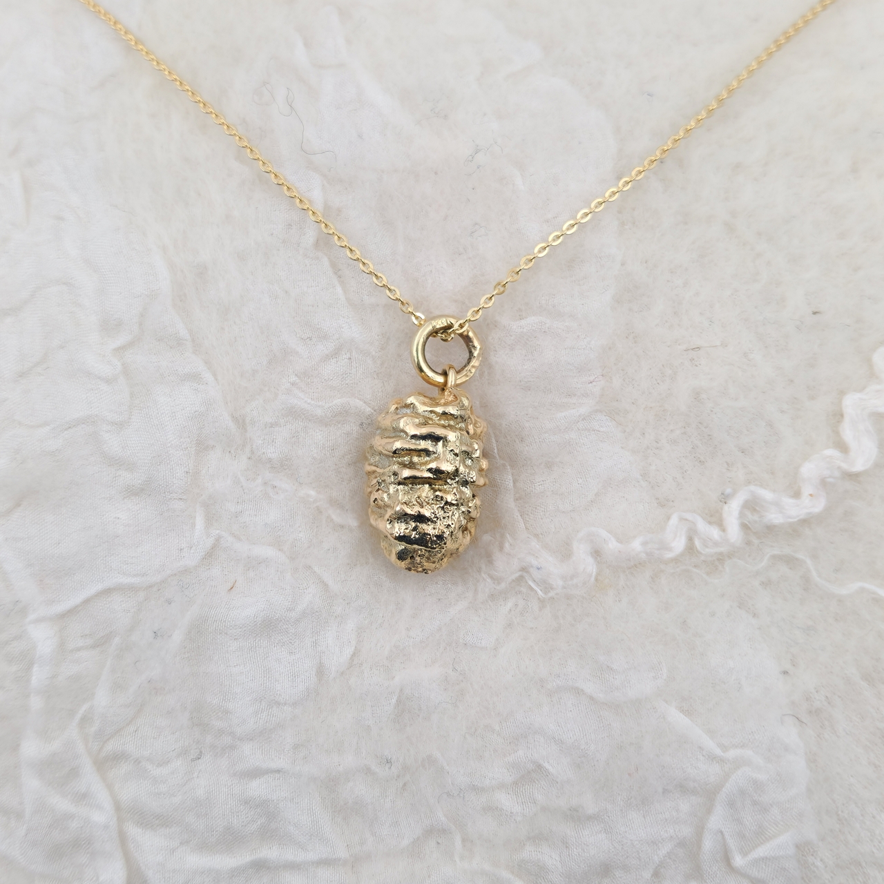 Sandstøpt anheng der forma er laget av ei kongle.